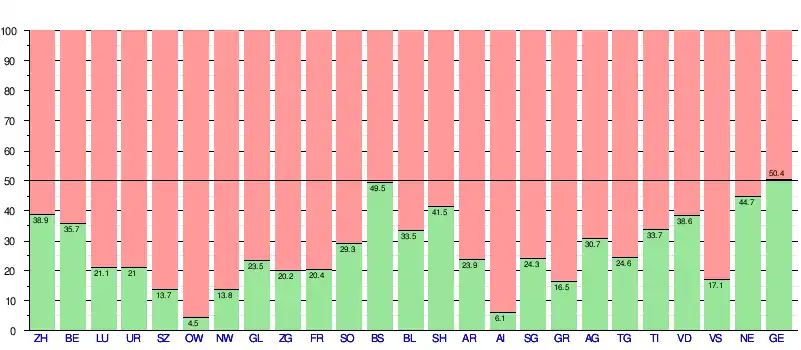 Soumise à la votation le , l'initiative est refusée par 18 6/2 cantons (soit tous à l'exception du canton de Genève) et 67,3 % des suffrages exprimés[6]. Le tableau ci-dessous détaille les résultats par cantons[7] :