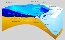 - l'inlandsis nord-américain qui couvrait une grande partie de l'Amérique du Nord et peut être divisée en l'inlandsis laurentidien (ou calotte laurentide) et l'inlandsis de la Cordillère[4] ;