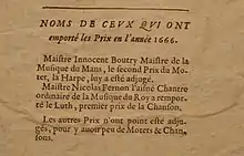 En 1666, il concourt au puy de musique d’Évreux et y reçoit la harpe d'argent, le second prix attribué pour le motet[10]. La même année, il est juge au puy de musique du Mans, faisant chanter les deux motets reçus et dont le meilleur n’est autre que celui de Louis Bouteiller, alors jeune musicien au Mans, et ex-enfant dans la psallette qu’il dirige, de facto exclu du concours[11].