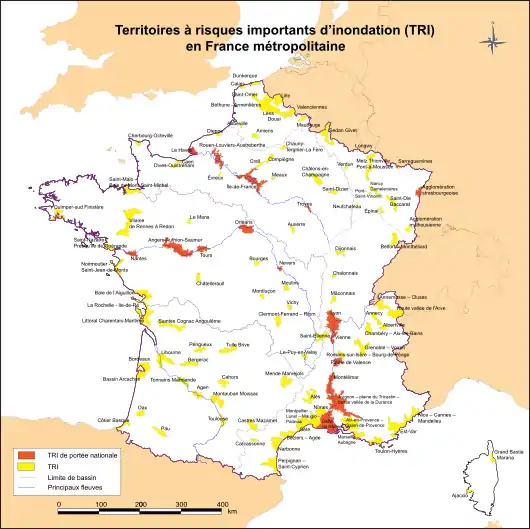 Dans cette zone inondable ont été identifiés 122 territoires à risques importants d'inondation dont 16 de portée nationale. 111 sont situés en métropole et 11 dans les DOM. La répartition par bassin est présentée dans le tableau suivant.