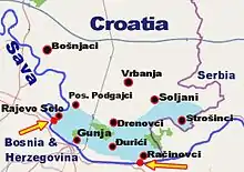 La Slavonie est la région la plus touchée par les inondations. La digue située dans la Save commence à se rompre près de Rajevo Selo et Račinovci, forçant ainsi l'évacuation de la population à Gunja, Rajevo selo et Račinovci. Le , près de 15 000 personnes dans la région croate est sont évacuées[26]. La digue de Slavonski Šamac atteint, elle, un point critique causé par l'énorme quantité d'eau en provenance de Bosnie. De nombreux officiels rapportent que si la digue cédait, le sud de la Slavonie et sa population de 300 000 personnes, seraient inondés[27]. Des inondations touchent également la région de Banovina, en particulier les villes de Hrvatska Kostajnica et Dvor, principalement causées par la Una, dans le niveau n'a pas monté depuis 1955[28].