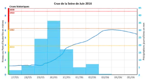 La Seine atteint, dans l'après-midi du 3 juin 2016, son plus haut niveau depuis les inondations de 1982 avec 6,07 mètres. Cependant, le record de 1910 n'est pas atteint à Paris puisque la Seine entame sa décrue dans la nuit du 3 au 4 juin, après avoir atteint une hauteur de 6,10 m à 2 h du matin[23].