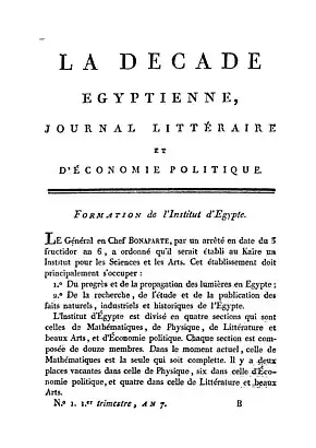 - du au , La Décade égyptienne[3], revue savante consacrée aux mémoires et rapports des membres de l’Institut.