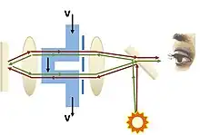 Dans les expériences historiques du XIXe siècle, on observait, avec un télescope muni d’un diaphragme portant deux trous distants de d, une source uniforme (en rouge). Si la source avait un diamètre apparent très petit, les rayons provenant de ses différents points arriveraient pratiquement en phase sur les deux trous et on observerait des franges d’interférence (trous d'Young). Mais si le diamètre apparent est plus grand, il y a destruction partielle des interférences. La figure est dessinée dans le cas où la destruction est totale : les rayons provenant du milieu A de la source arrivent en phase sur les deux trous, mais ceux qui arrivent du bord B arrivent déphasés de λ/2 et détruisent les franges provenant de A. Ceci se produit pour tous les couples de points de la source séparés angulairement de θ = λ/2d, soit pour une largeur angulaire de la source de λ/d, condition pour qu’il n’y ait pas de franges.