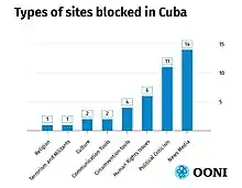 Selon un rapport de l'OONI de 2019, au moins 41 sites sont bloqués à Cuba. Le gouvernement crée des versions alternatives des principaux réseaux sociaux, ce qui permet d'en modérer le contenu[20].