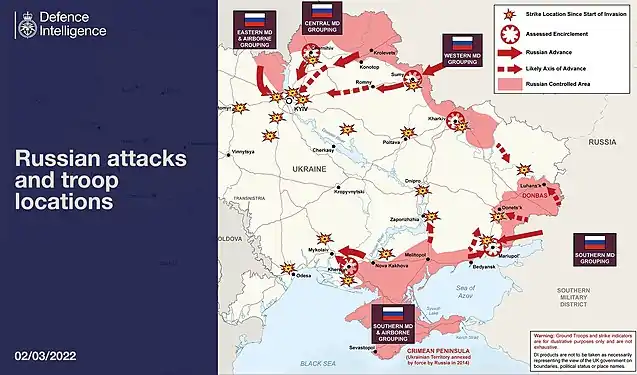 Selon la BBC, environ 35 000 soldats russes sont déployés aux frontières avec l'Ukraine en temps normal. Cependant, au , la Russie a concentré près des frontières de l'Ukraine (y compris sur le territoire de la Biélorussie et en Crimée), de 169 à 190 000 soldats selon les États-Unis et 149 000 selon le ministre de la Défense de l'Ukraine. Le 28 février, le représentant officiel du ministère de la Défense de la fédération de Russie, Igor Konachenkov, a déclaré que seuls les militaires de carrière participent aux hostilités, mais le 9 mars, il a admis que plusieurs conscrits avaient été capturés par les autorités ukrainiennes, tout en affirmant que la plupart avaient été ramenés en territoire russe[152].