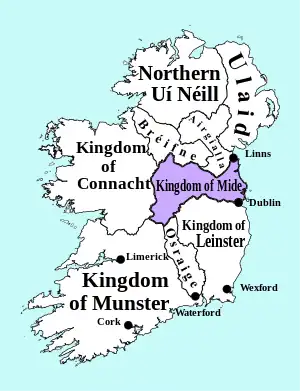 À la mort de celui-ci en 1166 Diarmait Mac Murchada (Dermot MacMurragh) est chassé de son trône par une coalition dirigée par le haut-roi d'Irlande Ruaidri Ua Conchobair (Rory O'Connor) et le roi de Breifne Tigernán Ua Ruairc (en) (Tiernan O'Rourke), tout en étant autorisé à garder le titre de Uí Cheinnselaigh (Hy-Kinsellagh).