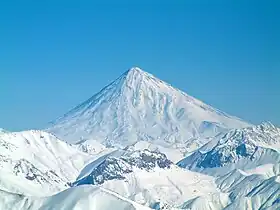 Le relief iranien est dominé par plusieurs chaînes de montagnes qui séparent divers bassins et plateaux. Le sommet le plus haut de l’Iran, le mont Damavand, culmine à 5 610 m[37]. Plus haute montagne eurasiatique à l'ouest de l'Hindou Kouch, il fait partie des monts Elbourz, qui surplombent la mer Caspienne au nord. Les monts Zagros coupent le pays du nord-ouest au sud-est, d'une altitude dépassant les 3 000 m, avec au moins cinq sommets de plus de 4 000 m. Vers le sud du pays, l'altitude moyenne des sommets descend brusquement jusqu'en dessous de 1 500 m. L’Iran est situé dans une zone sismique très instable et est régulièrement touché par des tremblements de terre. Le paysage accidenté de l'Iran a surgi de la dernière grande collision tectonique des continents. En s'éloignant de l'Afrique, le nord de la plaque arabique a heurté la plaque eurasiatique, il y a 25 ou 30 millions d'années, peu après la création de l'Himalaya lors de la poussée de la plaque indienne. L'impact a soulevé pratiquement toutes les chaînes de montagnes de l'Iran, ainsi que le plateau central, qui passe de 2 000 m d'altitude dans le Nord-Ouest à moins de 500 m dans les bassins désertiques de l'Est. La collision, toujours à l'œuvre, est responsable des nombreux tremblements de terre[38],[39]. Le plateau Iranien, constitué de plusieurs bassins fermés, est la zone située entre les chaînes de montagnes localisées à l’est et à l’ouest du pays. L'altitude moyenne de ce plateau est d'environ 900 m, mais plusieurs sommets surplombant le plateau s'élèvent à plus de 3 000 m. La partie orientale du plateau est couverte par deux déserts salés, le Dacht-e Kavir et le Dacht-e Lout. La plaine du Khouzistan, au sud-ouest, est une extension de la plaine de Mésopotamie d'une largeur moyenne de 160 km. Elle entre sur environ 120 km à l'intérieur des terres avant de se heurter aux contreforts des monts Zagros. S'élevant à quelques mètres, elle est recouverte de marais. La plaine Caspienne, à la fois plus longue et plus étroite (640 km sur 50 km), s'insère entre la mer Caspienne et les contreforts des monts Elbourz. Sur la côte du golfe Persique et du golfe d'Oman, la chaine des Zagros vient se terminer directement sur le littoral.