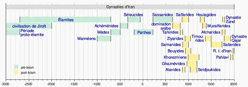 Le début du IIIe millénaire av. J.-C. voit apparaître une forme d’écriture, probablement dérivée du système sumérien, à Suse. L’Empire Élamite (précédé par la civilisation proto-élamite) établit un nouveau pouvoir régional dans le sud-ouest de l’Iran, et concurrence les empires voisins de Babylonie et d’Assyrie. C’est au cours du second millénaire avant notre ère qu’arrivent sur le plateau iranien divers peuples iraniens, provenant d’Asie centrale. Au milieu du VIIe siècle av. J.-C., les Mèdes, groupes de tribus établis au nord et au nord-ouest du pays, établissent leur pouvoir sur la région. À la fin de ce même siècle, les Mèdes et les Babyloniens se libèrent définitivement du joug assyrien en prenant Ninive en 610 av. J.-C.. C’est à la même période qu’apparaissent les premières sources mentionnant Cyrus Ier, roi d’Anshan, petit-fils d’Achéménès, fondateur du premier Empire perse, celui des Achéménides[15].