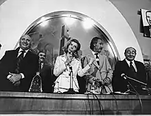 La vice-présidente et Première dame Isabel Perón recevant le président roumain Nicolae Ceaușescu et son épouse Elena, en mars 1974. Le président Perón est à droite.