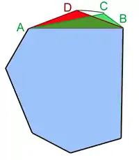 La lettre n désigne un entier plus grand que 2 et p un nombre réel strictement positif. La question à résoudre est de trouver, s'il existe, le polygone à n côtés et de périmètre p, ayant la plus grande aire. On peut remarquer qu'il suffit de chercher uniquement dans les polygones convexes. Le terme convexe signifie ici qu'un élastique entourant le polygone est toujours en contact avec sa frontière. Considérons, en effet, un polygone non convexe P1, par exemple celui illustré sur la figure de droite, en bleu. Son enveloppe convexe, c'est-à-dire la figure ayant pour frontière celle donnée par un élastique entourant le polygone P1, est un nouveau polygone P2, cette fois convexe. Le polygone P2 correspond à celui contenant les zones bleue et verte sur la figure. Son aire est strictement plus grande et son périmètre strictement plus petit. Une dilatation d'un rapport bien choisi, nécessairement supérieur à 1, appliquée à P2 définit un nouveau polygone P3 de même périmètre que celui de P1. L'aire de P1 est strictement plus petite que celle de P2, elle-même strictement plus petite que celle de P3. Le polygone P3 est de même périmètre que P1 et d'aire strictement plus grande. On en déduit que P1 n'est pas un candidat pour répondre au problème isopérimétrique.