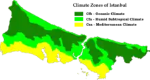Istanbul bénéficie d'un climat tempéré, influencé par des zones continentales, mais aussi par les masses maritimes au nord et au sud. Le climat d'Istanbul étant un climat de transition entre le climat océanique (classification de Köppen : Cfb), le climat subtropical humide (classification de Köppen : Cfa) et le climat méditerranéen (classification de Köppen : Csa). Les étés sont assez chauds, avec un air humide mais des pluies limitées (plus de 295 heures de soleil par mois en juin, juillet et août). Les hivers sont froids et humides, avec beaucoup de pluies et souvent de la neige, mais ils sont rarement glaciaux (moins de 76 heures de soleil par mois en décembre, janvier et février). Les printemps et les automnes sont doux et modérément humides.