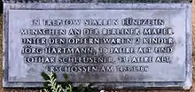 « À Treptow sont morts 15 personnes, victimes du mur de Berlin. Parmi eux figurent deux enfants, Jörg Hartmann, 10 ans, et Lothar Schleusener, 13 ans, abattus le 14 mars 1966. »
