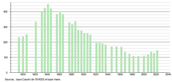 L'évolution du nombre d'habitants est connue à travers les recensements de la population effectués dans la commune depuis 1793. Pour les communes de moins de 10 000 habitants, une enquête de recensement portant sur toute la population est réalisée tous les cinq ans, les populations légales des années intermédiaires étant quant à elles estimées par interpolation ou extrapolation[17]. Pour la commune, le premier recensement exhaustif entrant dans le cadre du nouveau dispositif a été réalisé en 2006[18].