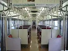 - La zone du siège près de la porte passager est un siège longitudinal[3] modifié à partir d'une voiture mise au rebut d'une autre série, et le reste est un agencement de sièges transversaux[4] avec l'accoudoir coté fenêtre retiré.