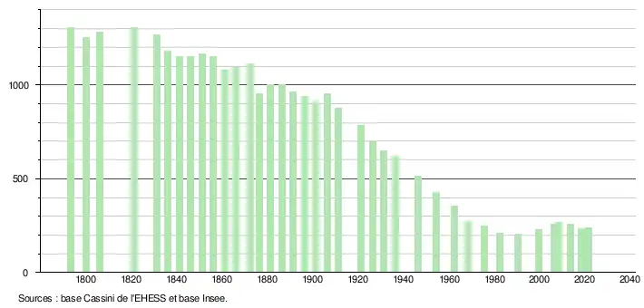 L'évolution du nombre d'habitants est connue à travers les recensements de la population effectués dans la commune depuis 1793. Pour les communes de moins de 10 000 habitants, une enquête de recensement portant sur toute la population est réalisée tous les cinq ans, les populations légales des années intermédiaires étant quant à elles estimées par interpolation ou extrapolation[25]. Pour la commune, le premier recensement exhaustif entrant dans le cadre du nouveau dispositif a été réalisé en 2008[26].