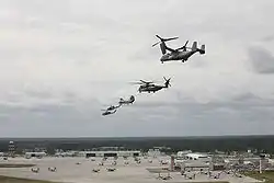 Un V-22 Osprey, un CH-53E Super Stallion, un CH-46 Sea Knight, un UH-1N Huey, et un AH-1 Cobra en vol à la Marine Corps Air Station New River de Jacksonville le 18 mars 2008.