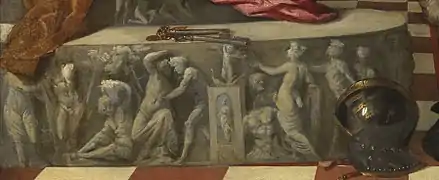 Au-dessous du saint, les bas-reliefs de style classique sont représentés à deux niveaux. Comme dans ceux de l'Amour sacré et Amour profane, leur sujet exact a échappé à l'identification, mais Vénus et Cupidon semblent y figurer. Cela peut simplement faire allusion à Paphos, qui à l'époque classique était sacré pour Vénus[9] ou, comme le suggère le musée, être une allégorie qui « démontre comment Pesaro, par son amour de Dieu, a remporté la victoire sur Santa Maura »[10].
