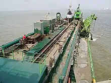 Dans le cas où le contenu de la trémie doit être déchargé à terre, il est possible de relier la drague à la terre par un tuyau flexible. La connexion se fait à la proue du navire et c'est la pompe de dragage du navire qui décharge le contenu de la trémie à terre.