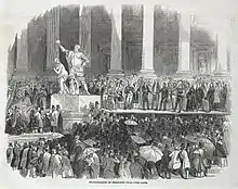 Au moment d'entrer en fonction le , Polk était à 49 ans le plus jeune président de l'histoire américaine. L'investiture de Polk fut la première cérémonie de ce genre à être annoncée par le télégraphe et à faire l'objet d'une illustration dans la presse — en l'occurrence l'Illustrated London News[45]. Dans son discours d'investiture, prononcé sous une pluie battante, Polk exprima clairement son soutien à l'annexion du Texas en l'incluant implicitement dans les « 28 États de l'Union ». Il revendiqua sa fidélité aux principes de Jackson en citant ce toast porté par son mentor : « tout homme qui aime son pays doit trembler à l'idée de sa dissolution et doit adopter ce sentiment patriotique : à notre Union, elle doit être maintenue ». Il déclara ensuite qu'il était opposé à la création d'une banque nationale et que les droits de douane n'excluaient pas un protectionnisme ponctuel. Il fit également allusion, sans y faire directement référence, à la question de l'esclavage en critiquant ceux qui tentaient d'abattre une institution protégée par la Constitution[46]. Polk consacra la deuxième partie de son discours à la politique étrangère, et plus spécifiquement à l'expansion territoriale. Il se félicita du processus d'annexion du Texas, déclarant que cela n'était l'affaire d'aucune autre nation et certainement pas celle du Mexique. Il parla enfin du territoire de l'Oregon et des migrants en promettant de sauvegarder les intérêts des États-Unis dans cette région et de protéger les colons[47].