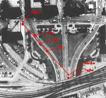 Au moment de l'assassinat, Tague se tenait près du trottoir sud de Main Street à peu près à hauteur du pont sous lequel Main Street et Elm Street passent.