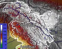 Le Jammu-et-Cachemire abrite plusieurs vallées telles que la vallée du Cachemire, la vallée du Tawi, la vallée du Chenab, la vallée du Poonch, la vallée du Sind et la vallée du Lidder. L'Himalaya sépare la vallée du Cachemire du plateau tibétain tandis que la chaîne Pir Panjal, qui entoure la vallée à l'ouest et au sud, la sépare des grandes plaines du nord de l'Inde. Le long du flanc nord-est de la vallée s'étend la chaîne principale de l'Himalaya. Cette vallée a une altitude moyenne de 1 850 m, mais la chaîne environnante de Pir Panjal a une altitude moyenne de 3 048 m. La rivière Jhelum est la principale rivière himalayenne qui traverse la vallée du Cachemire[16]. Le Tawi, Ravi et Chenab sont les principaux fleuves qui traversent la région.