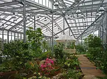 - Serres d'une surface totale de 2 100 m2 sous verre comprenant 2 239 taxons de plantes tropicales et subtropicales, dont 311 taxons d'orchidées et 958 taxons de cactus et autres succulentes.