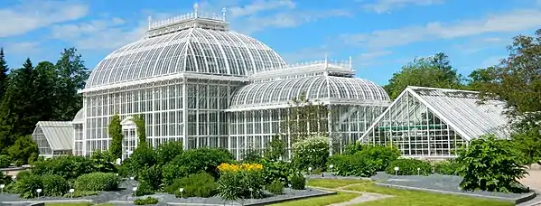 Les bâtiments actuels du jardin botanique sont dus à Gustaf Nyström. Les serres à armature en bois d’origine conçues par Franz Faldermann sont remplacées à la fin du XIXe siècle par de nouvelles serres à armatures métalliques conçues par Gustaf Nyström. La salle des palmiers est prête en 1889 et les autres serres en 1896.