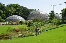 De plus, le jardin botanique dispose de trois serres hémisphériques qui sont aménagées en fonction de climats différents : la plus grande est consacrée aux plantes tropicales, les autres aux plantes subtropicales et aux plantes de savanes. On peut admirer de nombreuses espèces de palmiers, de fougères arborescentes, d'orchidées, etc., ainsi que trois aquariums qui reconstituent l'atmosphère des fleuves d'Afrique centrale, d'Amérique du Sud et d'Asie du Sud-Est.