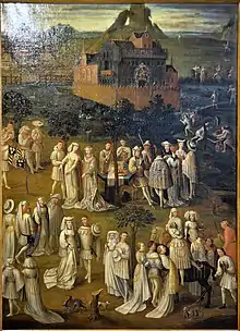 Presque tous les hommes représentés sur le tableau portent l'écuelle, caractéristique de la première moitié du XVe siècle. Femmes et hommes, nobles et serviteurs, sont tous vêtus de blanc. Le seul personnage dérogeant à ce code vestimentaire est le fou, visible dans le coin inférieur droit. Vêtu de rouge, il est doté d'un profil grotesque et tient une sorte de marotte[1]. À gauche du registre central, on voit un trio de musiciens. Un drapeau attaché à l'un de leurs instruments arbore les armes des ducs de Bourgogne.