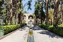 L'entrée principale se trouve dans le mur nord-ouest du jardin. Construit à l'époque safavide, le bâtiment fut considérablement restauré à l'époque qajar, en particulier sous la direction du ministre Mirza Mahmud Ehtesham ol-Saltaneh, au début du XXe siècle.