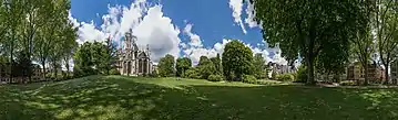 Le jardin est bordé par l'abbaye Saint-Ouen, dont le chevet domine la pelouse principale.