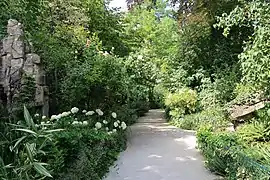 Son aménagement est de style anglais, dans une recherche romantique d'imitation de la nature avec une cascade, un ruisseau où nagent des poissons, une passerelle, une rocaille et une mare[1],[2],[3].