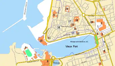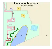 Légende: 1a- Corne du port, 1b- quai de pierre, 1c- plate-forme de décharge, 2a- Tracé des fortifications grecques de la deuxième moitié du IIe siècle av. J.-C., - 2b- Mur de Crinas, 2c- Tour nord, 2d- Tour penchée, 2e- Courtine, 2f- Tour sud, 3- Avant-mur (Ve siècle), 4- Bassin d'eau douce, 5- Terrasse funéraire à triglyphes bas, 6a- Puits disparu, 6b- Terrasse funéraire disparue, 7- Voie d'entrée (pavage), 8- Centre commercial.