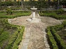 Il est composé de trois zones distinctes. La plus importante, au centre, est divisée en quatre quadrants entre lesquels on peut trouver plusieurs chemins en briques. À leur intersection se trouve une fontaine de granite, elle est constituée d'une colonne et d'une cuvette constituées de reliefs en spirales, à la manière d'une colonne salomonique.