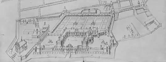Jardins du Château de Bury, ensemble détruit en 1642 (Jacques Ier Androuet du Cerceau, « Les plus excellents bastiments de France »).