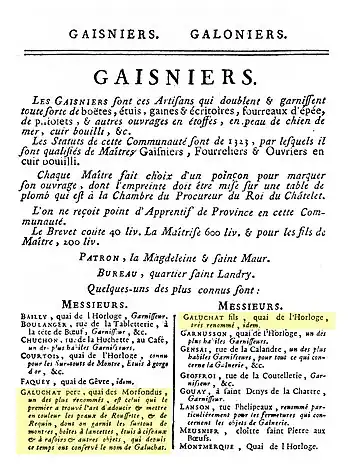Denis Claude Galluchat continua le travail de son père quai de l'Horloge, à l’extrémité du quai des Morfondus. Dans le Paris de cette époque, de nombreux ateliers d'orfèvres et de gainiers se situaient dans le quartier de la Tour de l'Horloge du Palais, par le quai des Mégissiers, le quai des Morfondus se prolongeant par le quai de l'Horloge.