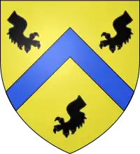 "D'or au chevron d'azur, accompagné de trois pattes de lion coupées de sable, armées de même, deux en chef affrontées, et une en pointe ; et pour cimier une patte de l'écu, entre deux ailes dragonnées d'or, d'azur et de sable"