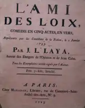 Ses deux premières pièces ont pour thème l'affaire Calas, rendue célèbre par Voltaire. Mais Jean-Louis Laya est connu surtout pour son Ami des lois, joué au Théâtre Français, alors rebaptisé théâtre des Nations, seulement dix-neuf jours avant l'exécution de Louis XVI. Le héros de cette comédie à la manière de Molière est un ci-devant qui soutient la Révolution tout en en condamnant les excès. Laya a l'audace d'y dépeindre Robespierre (« Nomophage ») et Marat (« Duricrane ») comme des Tartuffe dénués de scrupules et assoiffés de pouvoir. La pièce suscite d'intenses confrontations parmi les membres du public. Dix jours après sa première représentation, elle est interdite par la Commune. Laya se cache tandis que plusieurs personnes trouvées en possession de L'Ami des lois sont guillotinées. Reprise à la Convention, la pièce est de nouveau interdite pour cause de désordre public. Elle sera une nouvelle fois reprise après la chute de Robespierre, mais cette fois sans grand succès.