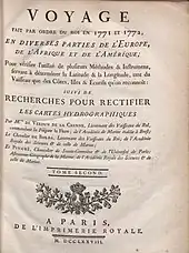 - Voyage fait par ordre du Roi en 1771 et 1772, en diverses parties de l'Europe, de l'Afrique et de l'Amérique; Pour vérifier l'utilité de plusieurs Méthodes & Instrumens, servant à déterminer la Latitude & la Longitude, tant du Vaisseau que des Côtes, Isles & Ecueils qu'on reconnoît: Suivi de Recherches pour rectifier les cartes hydrographiques. Par Mrs de Verdun de La Crenne, Lieutenant des Vaisseaux du Roi, commandant la Frégate la Flore; de l'Académie de Marine établie à Brest ; Le Chevalier de Borda, Lieutenant des Vaisseaux du Roi; de l'Académie Royale des Sciences & de celle de Marine ; Et PINGRE, Chancelier de Sainte-Geneviève & de l'Université de Paris ; Astronome-Géographe de la Marine, de l'Académie Royale des Sciences & de celle de Marine. Paris, Imprimerie Royale, 1778, ouvrage en 2 volumes