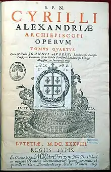 - Œuvres de saint Cyrille, patriarche d'Alexandrie, édition en grec et en latin, en 6 tomes, Paris, 1638[6]