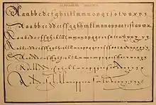 - Alphabet und aller art characteren, so iemals von Anbegin der Welt, bey allen Nationen, in allerlen Sprachen, im Brauch gewesen ausz vielen autoribus mit fleisz zusammen gezogen. Kunstlich in Kupffer gestochen, unnd von Neuwem an Taggeben, durch Joh. Theodorum, und Joh. Israel von Bry, gebruder. Franckfurt, 1596. 4° obl., 47 pl. Cat. Destailleur n° 833.