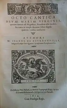 - Octo cantica Divæ Mariæ Virginis, quorum initium est Magnificat, secundum octo modos, seu tonos in templis decantari solitos singula quaternis vocibus constantia. Paris : Pierre I Ballard, 1614. 1 vol. 2°. Guillo 2016 no 1614-D2.