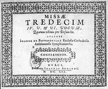 - Missæ tredecim, quarum ultima pro defunctis. Douai : Jean Bogard, 1619. 6 vol. 4° obl. RISM B 3843, Persoons 1989 no 45.