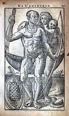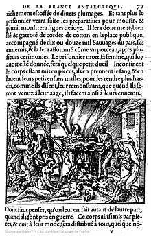 En 1555, André Thévet, cosmographe du roi de France, est parti avec l'explorateur, chevalier de Malte Villegagnon au Brésil pour trouver de nouvelles terres à coloniser. Après son retour en 1556 il a publié ses découvertes dans ses deux récits : Les Singularitez de la France antarctique (1557) puis la Cosmographie universelle (le livre XXI est consacré aux Tupinambás) (1575)[8]. La tribu qu’il a observée et sur laquelle il a formulé ses conclusions était les Tupinambas du Brésil, selon lui, « le peuple le plus cruel et inhumain de toute l'Amérique » et qui mange « ordinairement chair humaine, comme nous ferions du mouton »[9]. Auprès de cette même tribu, Jean de Léry a passé dix mois. Le chapitre pour lequel Thévet fut le plus critiqué par ce dernier est celui qui porte sur le cannibalisme. Ce chapitre contient des gravures de batailles épiques comme de l'abattage et de la consommation humaine ; on y voit même des enfants qui jouent avec une tête humaine séparée du corps comme avec un ballon. Images de Thévet