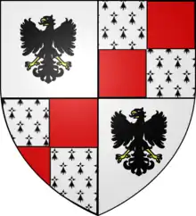 Tiercé en fasce d'azur, d'or et de gueules ; l'azur au sabre en fasce d'argent, l'or au crocodile de sinople, le gueules au signe des chevaliers légionnaires[6] - Livrées : les couleurs de l'écu, le verd en bordure seulement. |