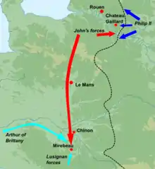 Carte de la campagne de Jean en 1202 qui culmina avec sa victoire à Mirebeau (en) ; les flèches rouges indiquent les mouvements des forces de Jean et les bleues celles de Philippe II.