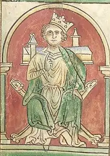 Jean, extrait d'une miniature de l'Historia Anglorum de Matthieu Paris, vers 1250-1255. Il tient dans sa main gauche l'abbaye de Beaulieu, dont il est le fondateur.