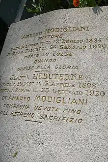 Le , Modigliani est enterré au cimetière du Père-Lachaise, accompagné des artistes de Montmartre et de Montparnasse, notamment Picasso, Soutine, Vlaminck, Cendrars. Jeanne Hébuterne est enterrée le lendemain au petit jour au cimetière de Bagneux dans l'intimité. Achille Hébuterne a refusé aux amis de Modigliani de faire enterrer sa fille aux côtés du peintre. Il faudra attendre 1930 avant qu'il revienne sur sa décision.