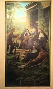Jeanne Mance au secours d'un blessé. Bronze de Louis-Philippe Hébert placé devant l'Hôtel-Dieu de l'avenue des Pins à Montréal. | |
